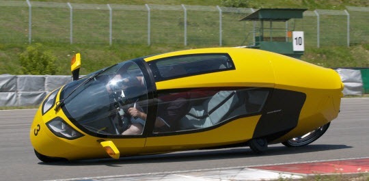 E-tracer a two seater, motorcycle-like electric vehicle.